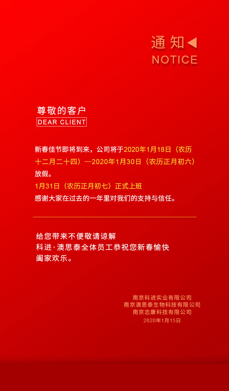 南京科進(jìn)實業(yè)有限公司2020年春節(jié)放假通知